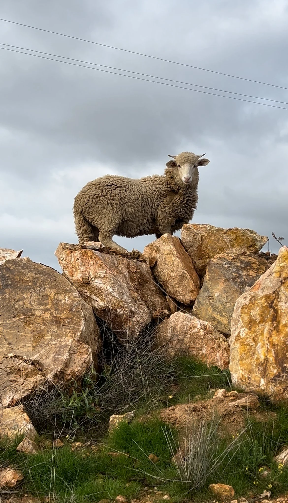 Perched atop ancient stones, a young lamb gazes over the land — a quiet guardian of tradition and time.